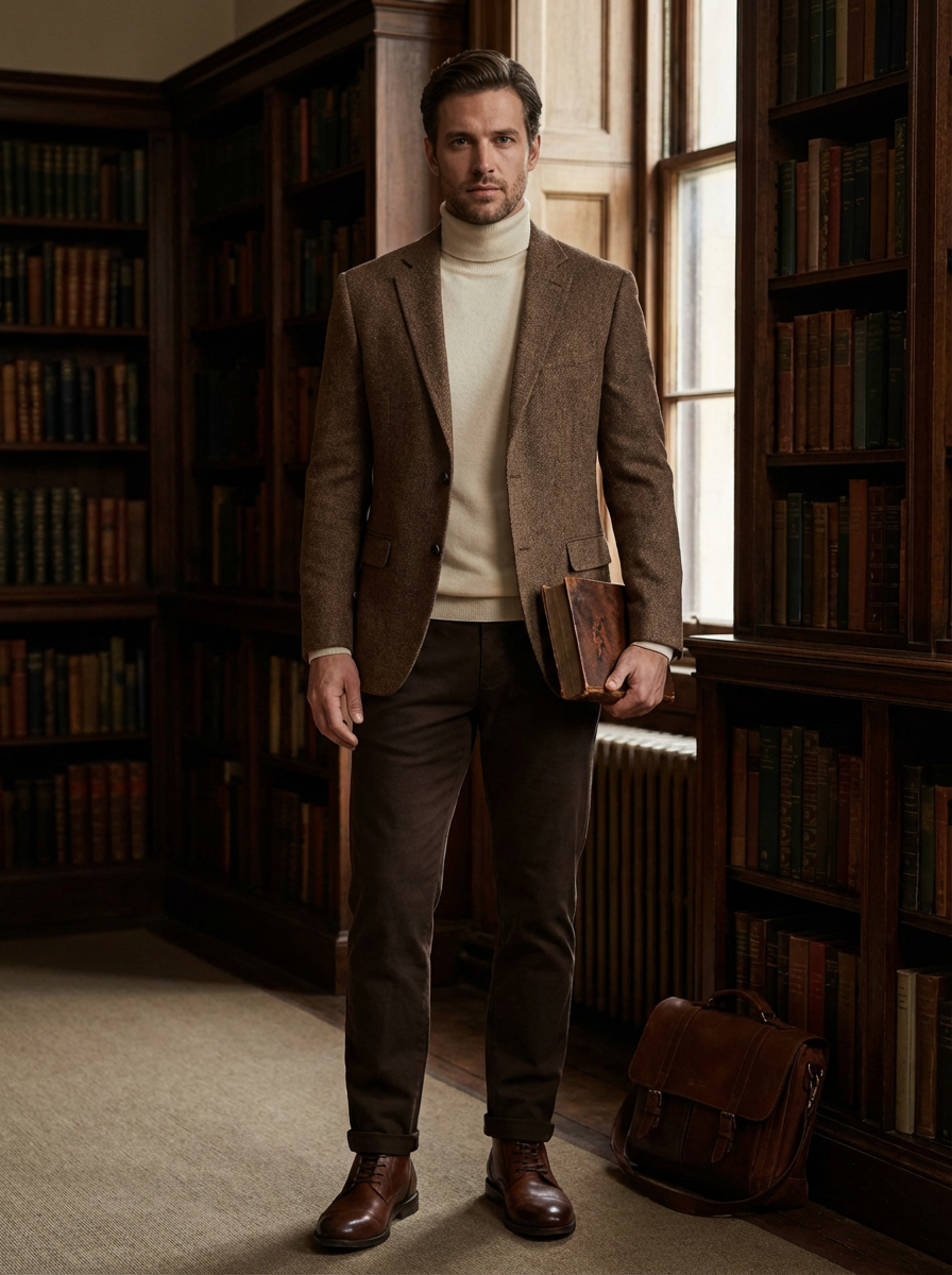 model in dark academia outfit, brown tweed blazer, cream turtleneck, vintage library background, moody lighting, holding old book