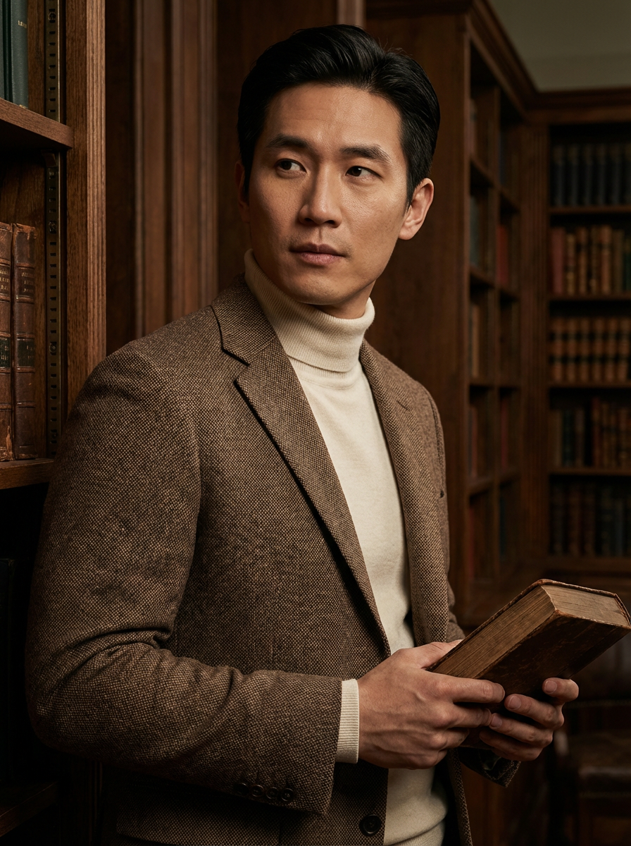 model in dark academia outfit, brown tweed blazer, cream turtleneck, vintage library background, moody lighting, holding old book