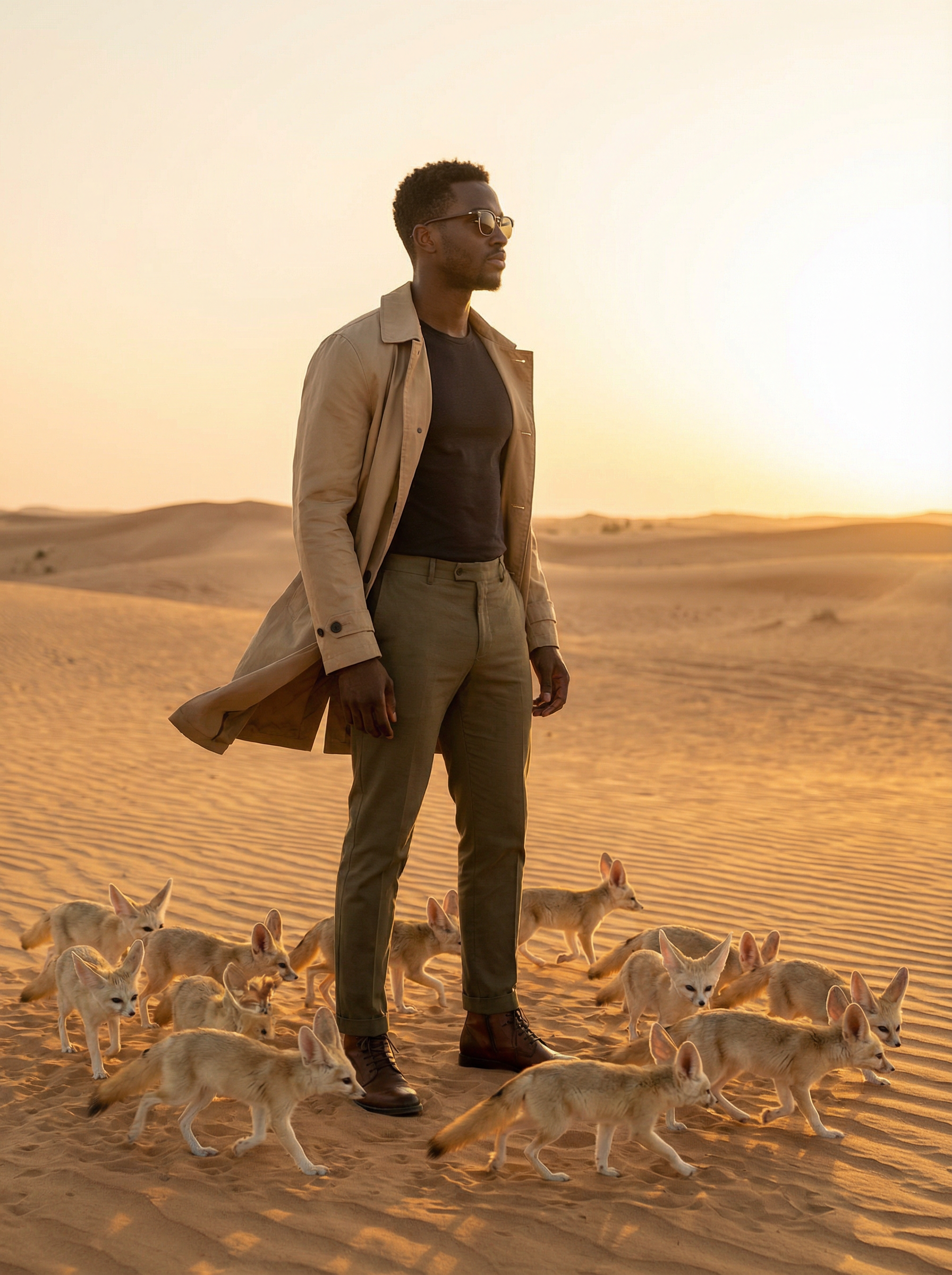 model in desert couture: lightweight trench, fitted tee, tailored pants, boots, sunglasses on sculpted sand dunes at sunset, 15 fennec foxes playing around the model’s feet, warm golden haze, cinematic editorial wide shot, ultra-realistic textures