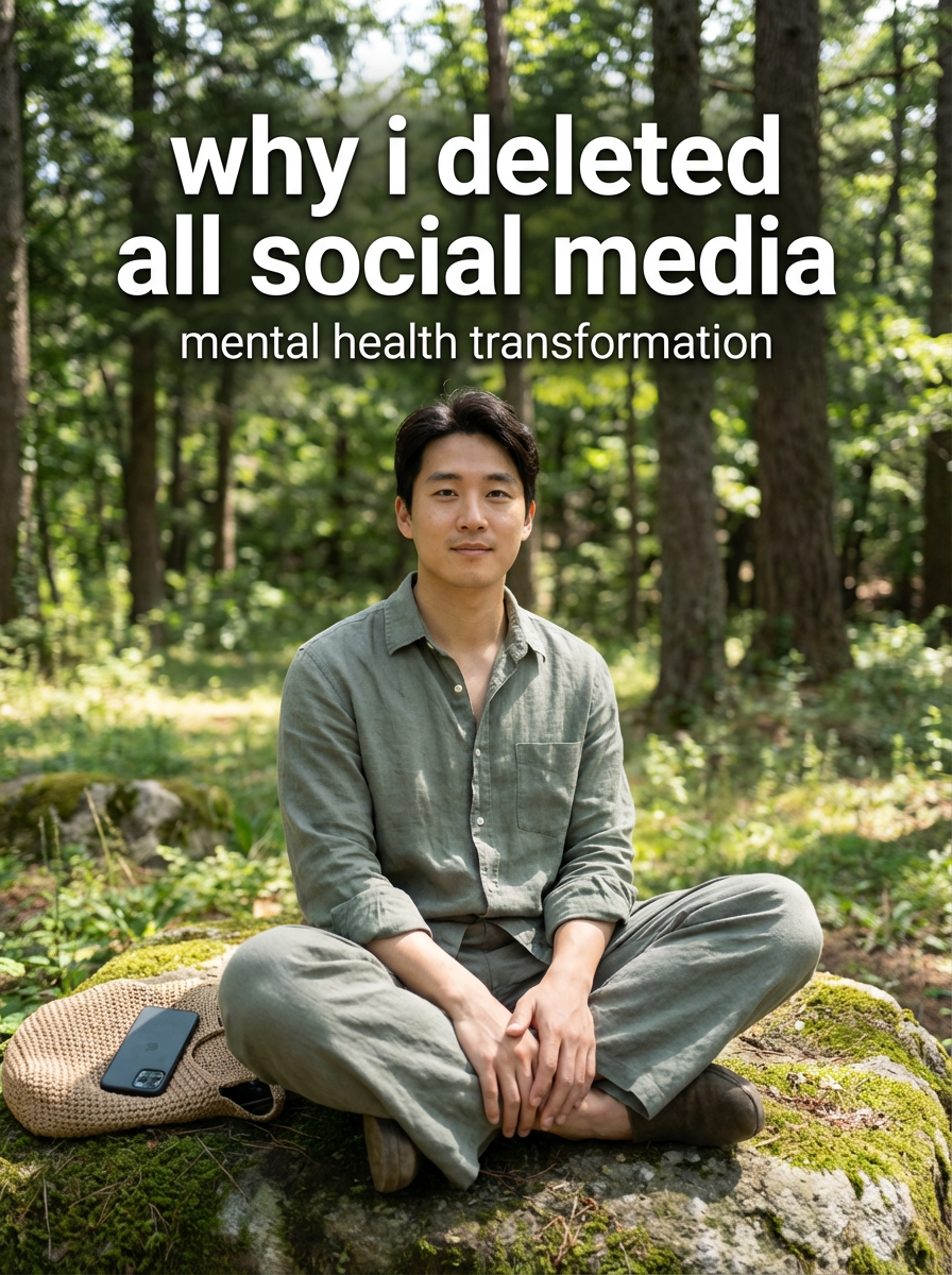 model in digital wellness attire in nature or peaceful setting, phone put away, serene expression, natural lighting. TikTok text overlay: "why i deleted all social media" smaller text: "(mental health transformation)", do not show tiktok interface