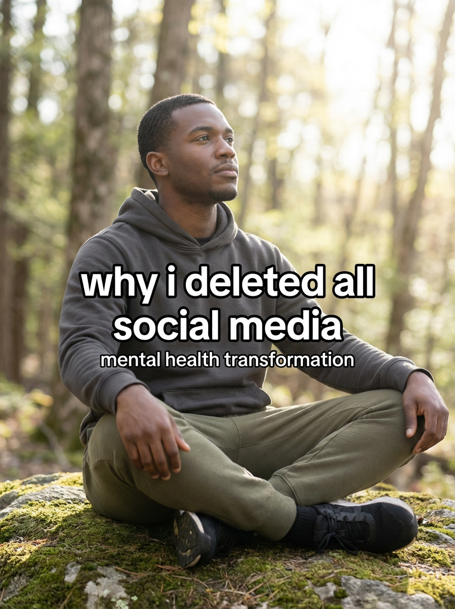 model in digital wellness attire in nature or peaceful setting, phone put away, serene expression, natural lighting. TikTok-style text overlay with white text with black outline: "why i deleted all social media" smaller text: "(mental health transformation)", do not show tiktok interface or logo