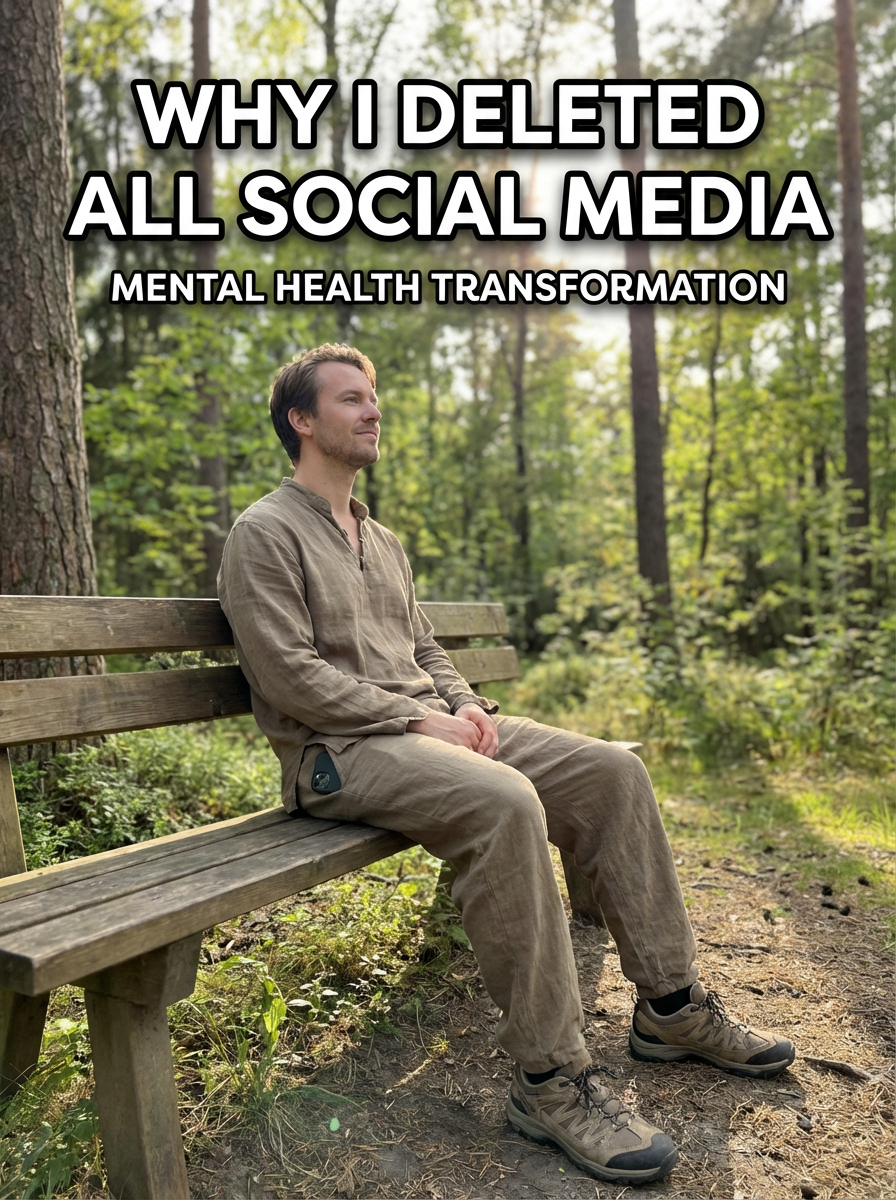 model in digital wellness attire in nature or peaceful setting, phone put away, serene expression, natural lighting. TikTok-style text overlay with white text with black outline: "why i deleted all social media" smaller text: "(mental health transformation)", do not show tiktok interface or logo