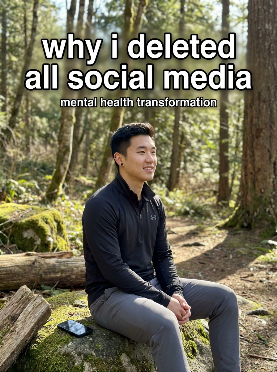 model in digital wellness attire in nature or peaceful setting, phone put away, serene expression, natural lighting. TikTok-style text overlay with white text with black outline: "why i deleted all social media" smaller text: "(mental health transformation)", do not show tiktok interface or logo