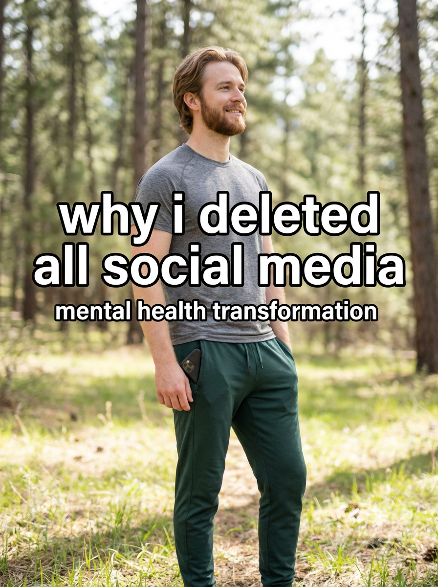 model in digital wellness attire in nature or peaceful setting, phone put away, serene expression, natural lighting. TikTok-style text overlay with white text with black outline: "why i deleted all social media" smaller text: "(mental health transformation)", do not show tiktok interface or logo