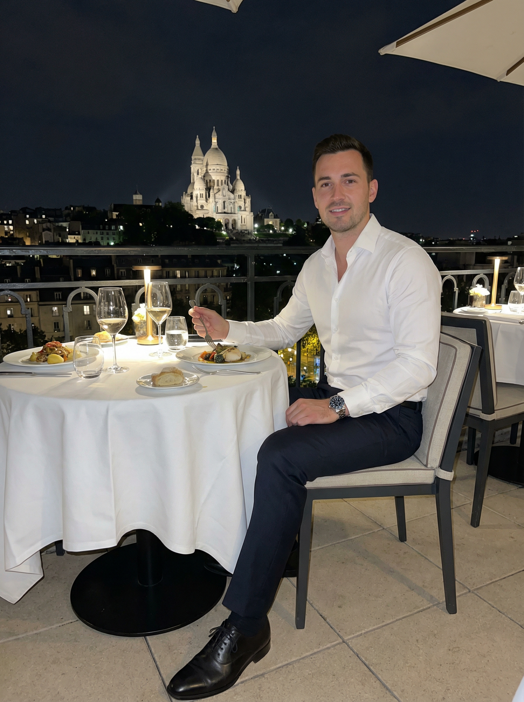 model in dress shirt, suit pants, dress shoes, watch dining at elegant restaurant terrace with Sacré-Cœur view, fine dining experience, white tablecloth, wine glasses, evening city lights, sophisticated dining scene