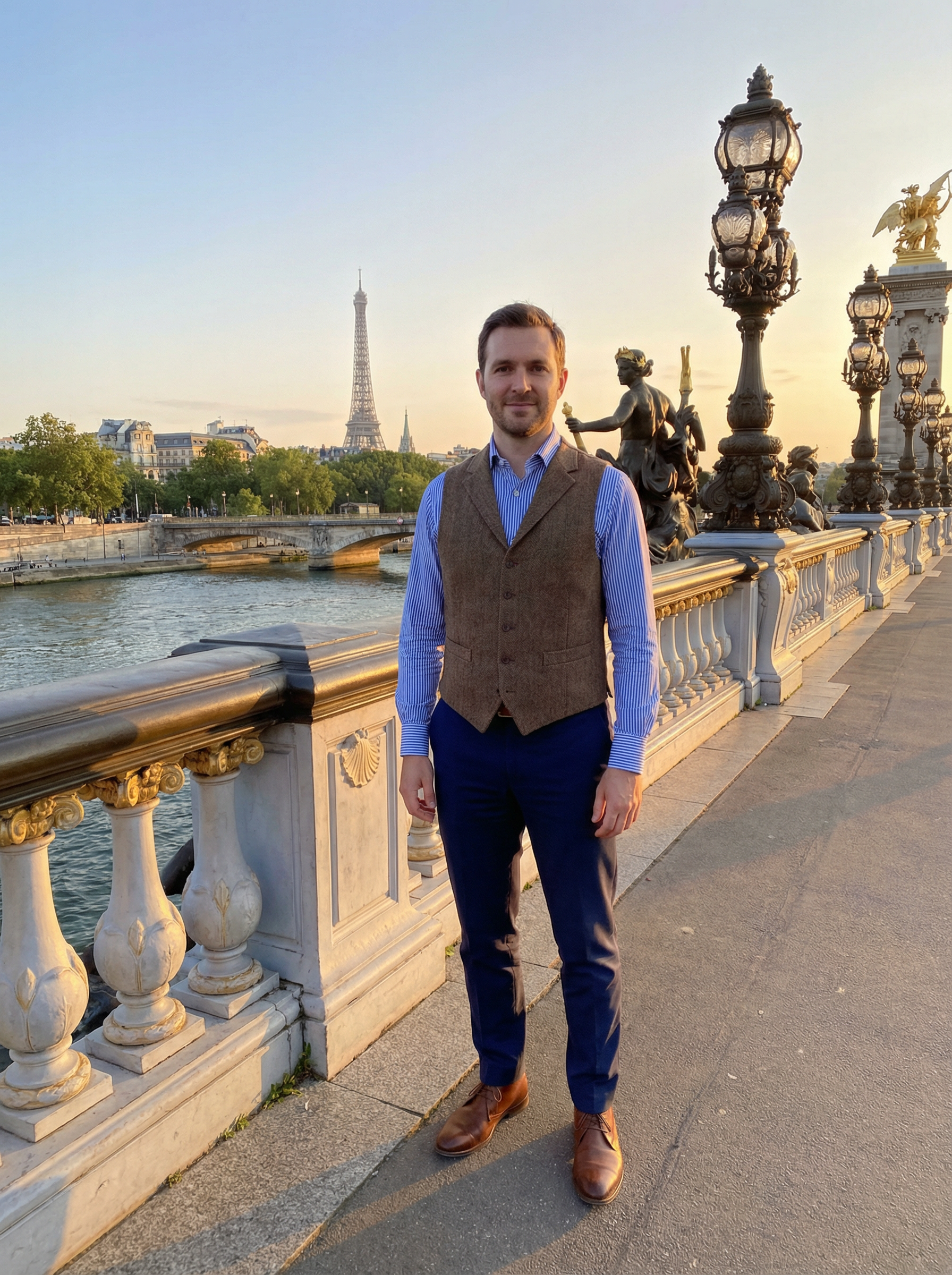 model in dress shirt, vest, dress pants, leather shoes on Pont Alexandre III bridge at sunset, ornate bridge details, Seine river below, golden romantic lighting, classic Parisian romance, architectural beauty