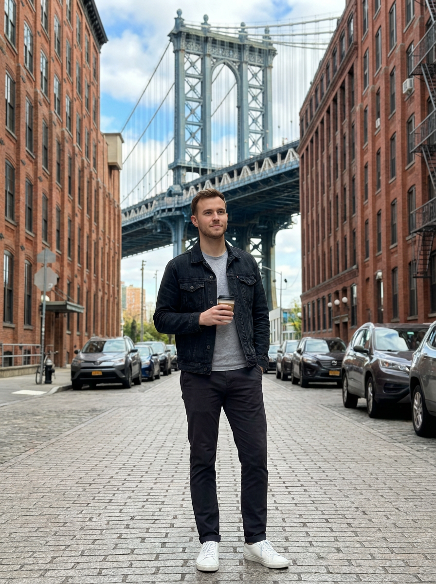 model in DUMBO Brooklyn, Manhattan Bridge view, Instagram-famous spot, stylish outfit