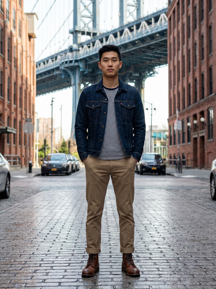 model in DUMBO Brooklyn, Manhattan Bridge view, Instagram-famous spot, stylish outfit