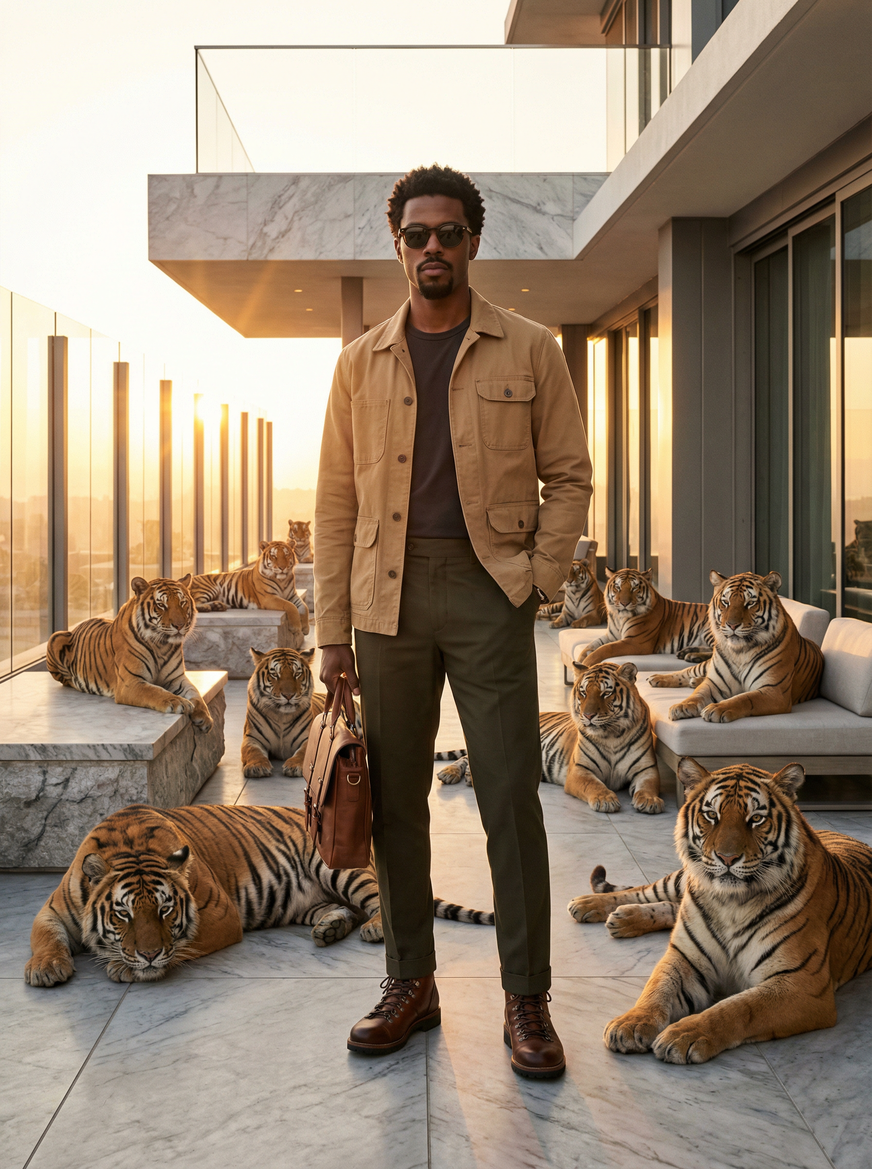 model in elevated safari look: utility jacket, tailored trousers, boots, minimal jewelry, sunglasses on a rooftop penthouse terrace at golden hour, marble and glass architecture, 15 majestic tigers lounging peacefully around the model like a fashion campaign set, calm controlled energy, ultra-realistic editorial lighting, dramatic composition, fashion magazine cover feel