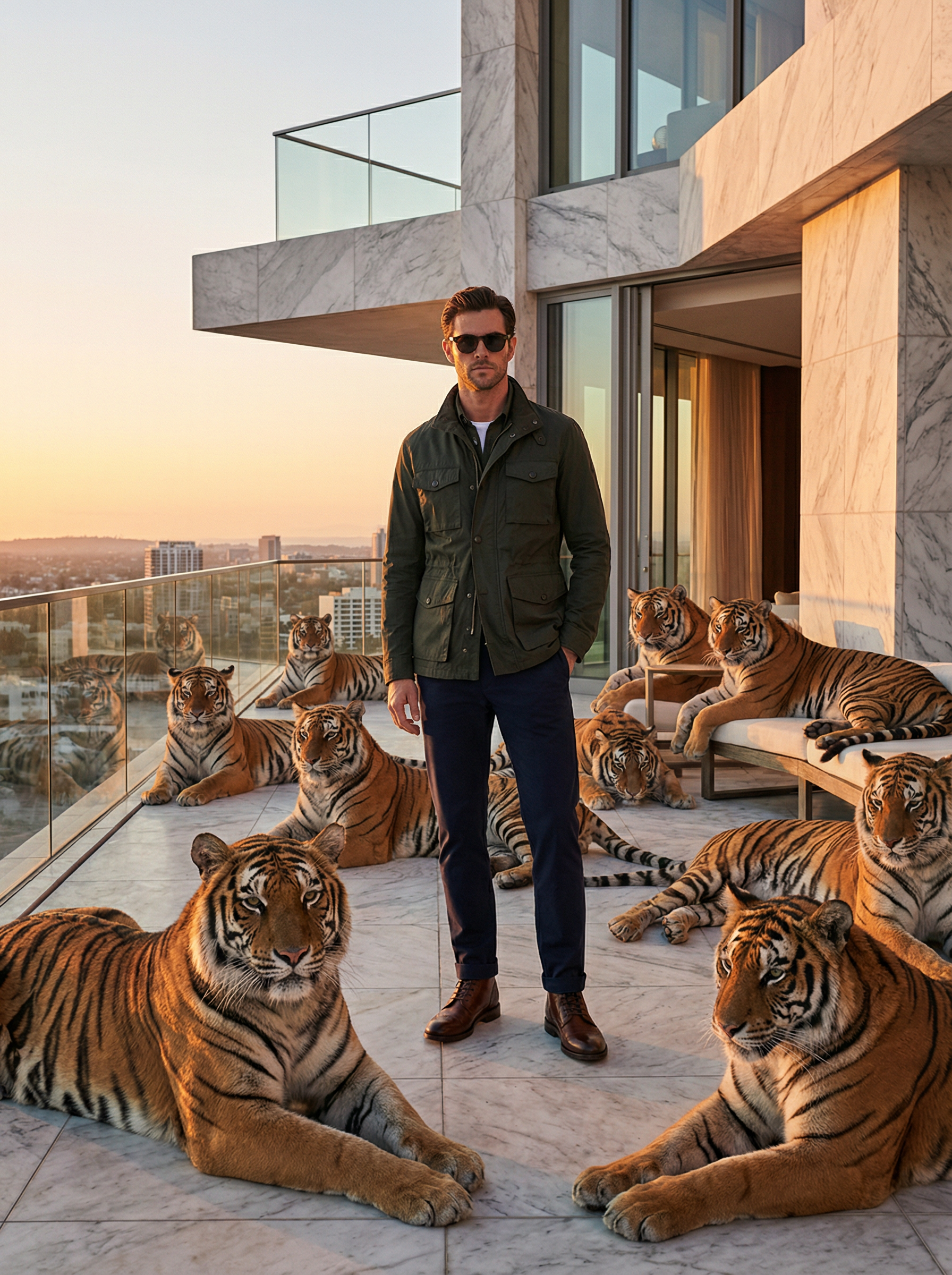 model in elevated safari look: utility jacket, tailored trousers, boots, minimal jewelry, sunglasses on a rooftop penthouse terrace at golden hour, marble and glass architecture, 15 majestic tigers lounging peacefully around the model like a fashion campaign set, calm controlled energy, ultra-realistic editorial lighting, dramatic composition, fashion magazine cover feel