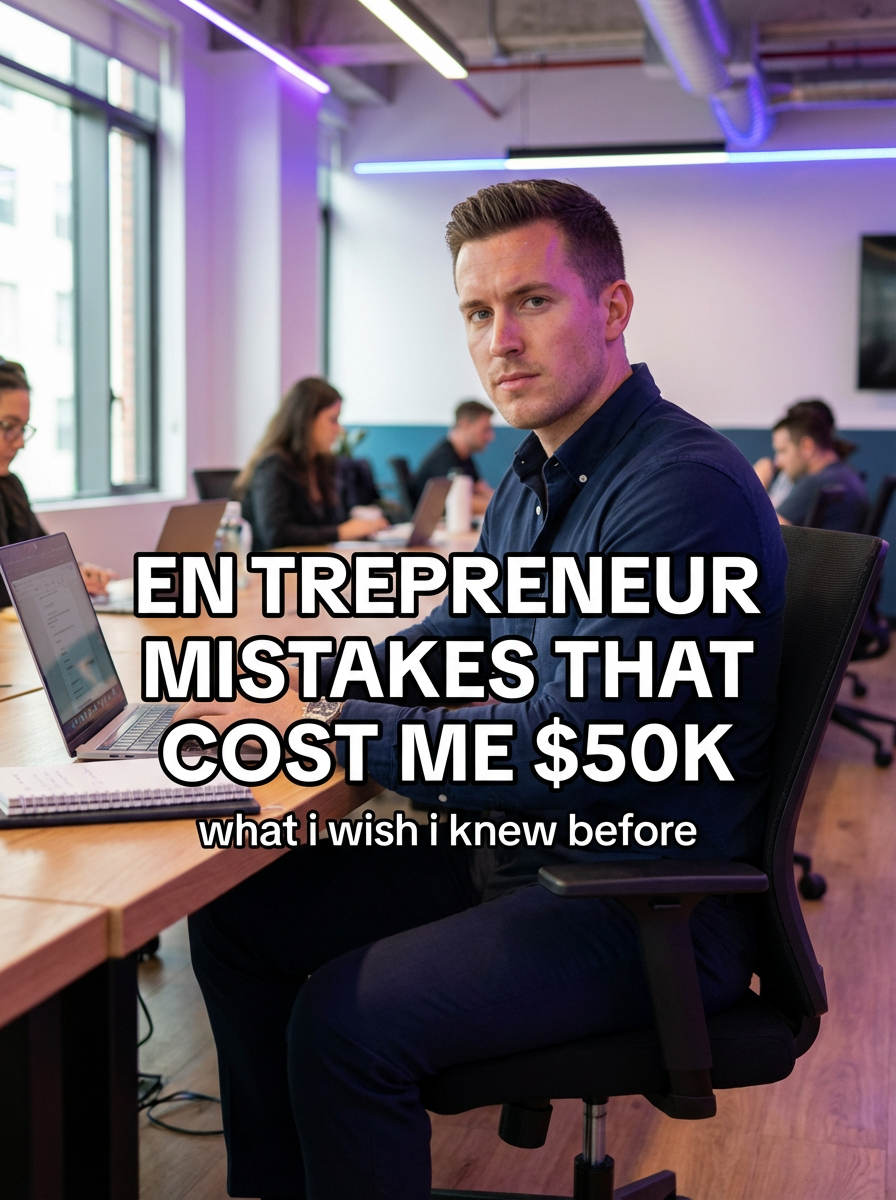 model in entrepreneur casual in modern co-working space, laptop and notes, determined expression, innovative lighting. TikTok TikTok-style text overlay with white text with black outline: "entrepreneur mistakes that cost me $50k" smaller text: "(what i wish i knew before)", do not show tiktok interface or logo