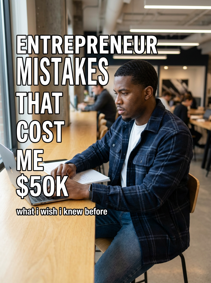 model in entrepreneur casual in modern co-working space, laptop and notes, determined expression, innovative lighting. TikTok TikTok-style text overlay with white text with black outline: "entrepreneur mistakes that cost me $50k" smaller text: "(what i wish i knew before)", do not show tiktok interface or logo