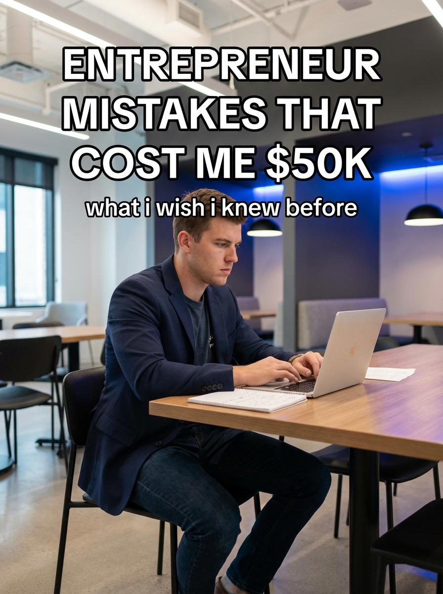 model in entrepreneur casual in modern co-working space, laptop and notes, determined expression, innovative lighting. TikTok-style text overlay with white text with black outline: "entrepreneur mistakes that cost me $50k" smaller text: "(what i wish i knew before)", do not show tiktok interface or logo
