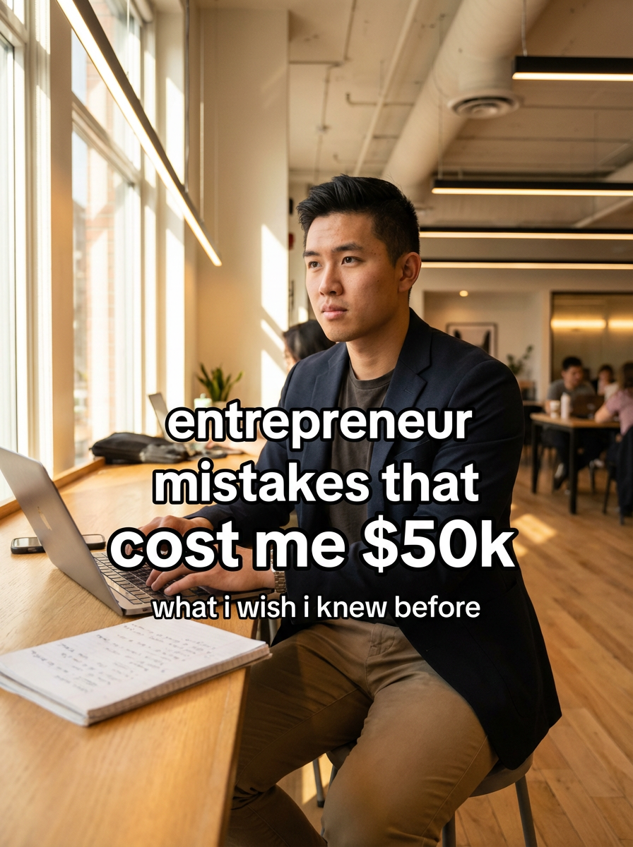model in entrepreneur casual in modern co-working space, laptop and notes, determined expression, innovative lighting. TikTok-style text overlay with white text with black outline: "entrepreneur mistakes that cost me $50k" smaller text: "(what i wish i knew before)", do not show tiktok interface or logo