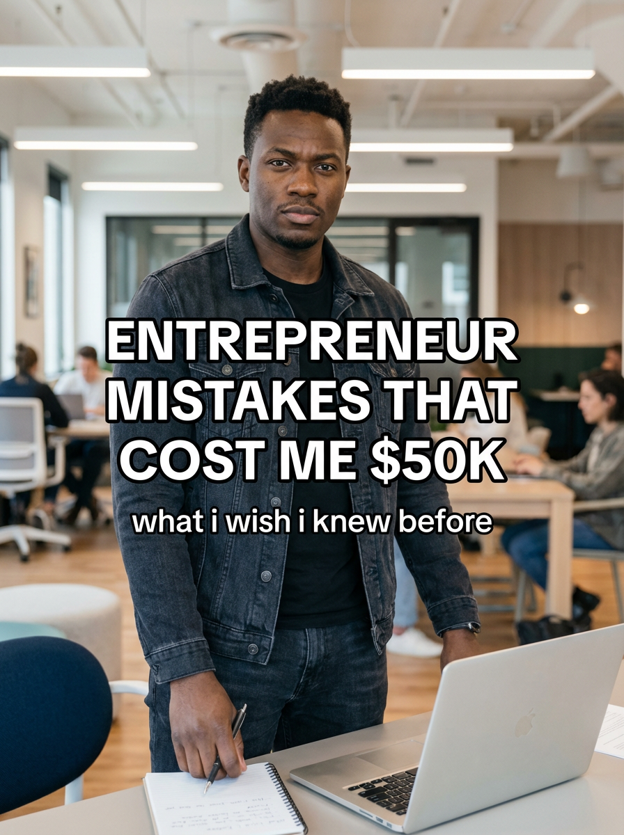 model in entrepreneur casual in modern co-working space, laptop and notes, determined expression, innovative lighting. TikTok-style text overlay with white text with black outline: "entrepreneur mistakes that cost me $50k" smaller text: "(what i wish i knew before)", do not show tiktok interface or logo