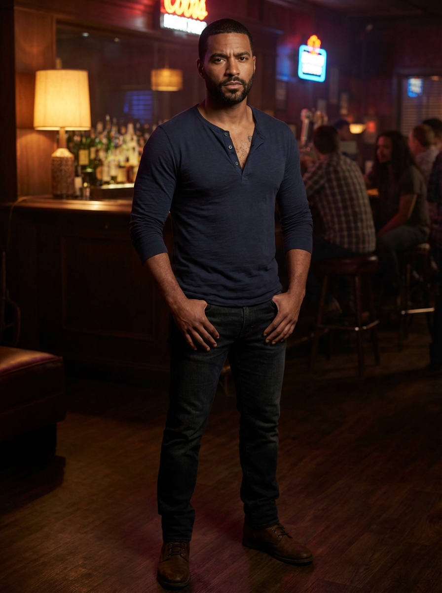 model in fitted henley shirt unbuttoned, hint of chest, rugged handsome face, moody bar lighting