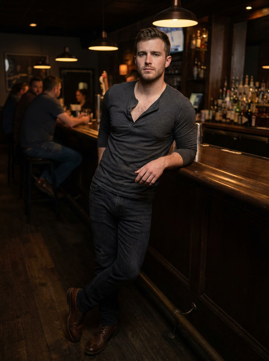 model in fitted henley shirt unbuttoned, hint of chest, rugged handsome face, moody bar lighting