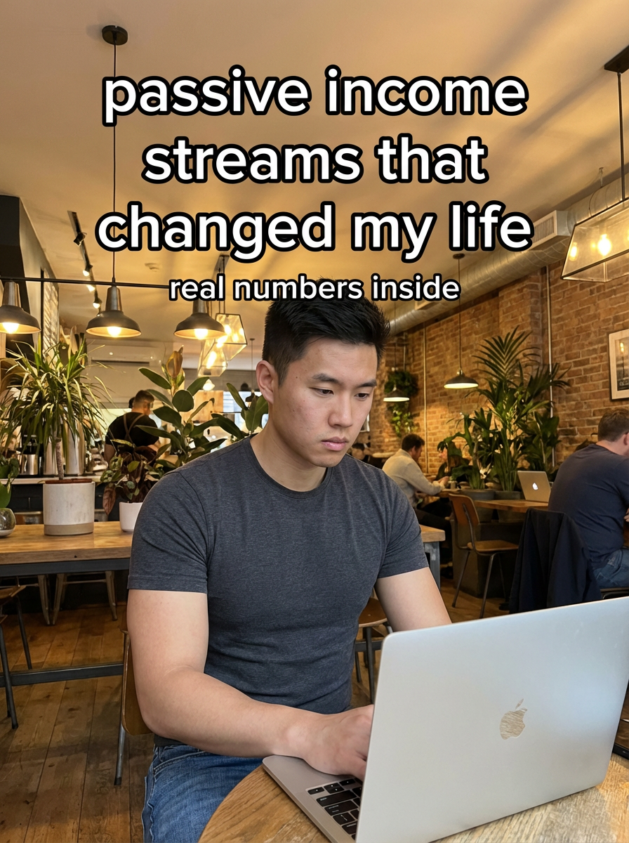 model in fitted t-shirt and jeans in trendy coffee shop, laptop open, focused expression, warm cafe lighting, plants and modern decor. TikTok TikTok-style text overlay with white text with black outline: "passive income streams that changed my life" smaller text: "(real numbers inside)", do not show tiktok interface or logo