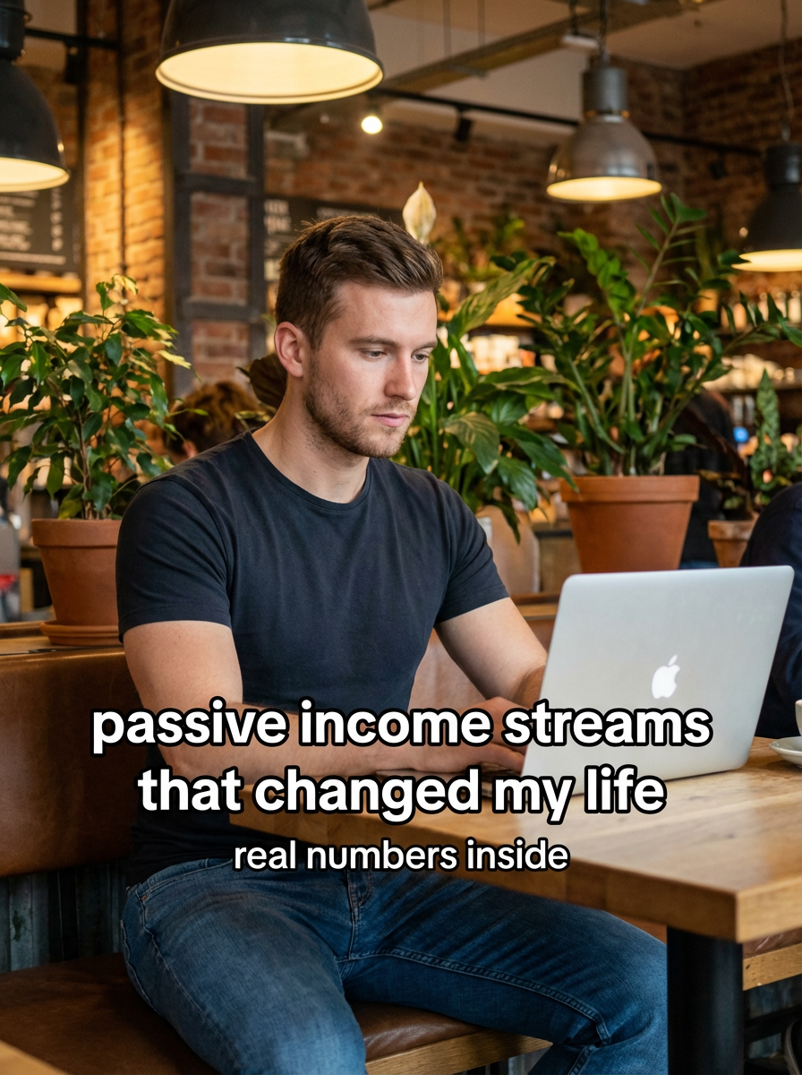 model in fitted t-shirt and jeans in trendy coffee shop, laptop open, focused expression, warm cafe lighting, plants and modern decor. TikTok TikTok-style text overlay with white text with black outline: "passive income streams that changed my life" smaller text: "(real numbers inside)", do not show tiktok interface or logo