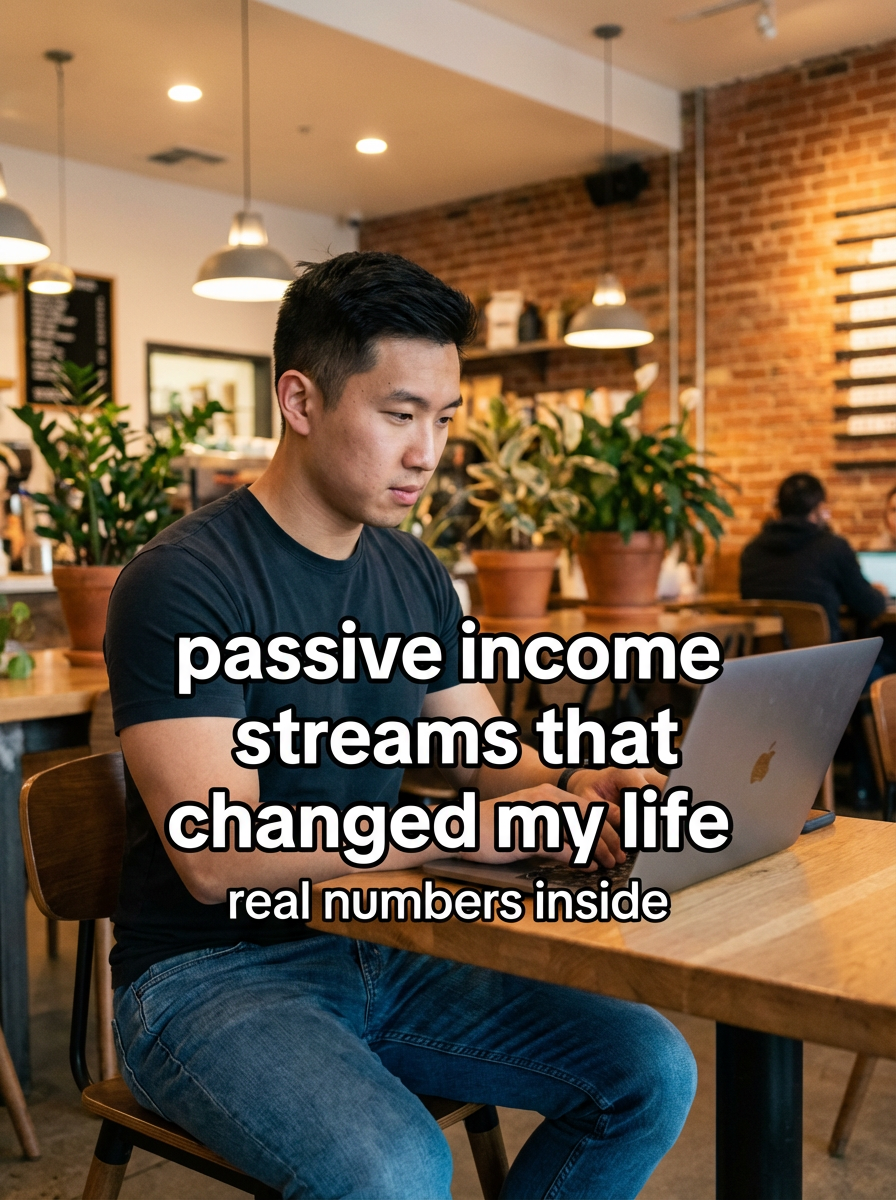 model in fitted t-shirt and jeans in trendy coffee shop, laptop open, focused expression, warm cafe lighting, plants and modern decor. TikTok-style text overlay with white text with black outline: "passive income streams that changed my life" smaller text: "(real numbers inside)", do not show tiktok interface or logo