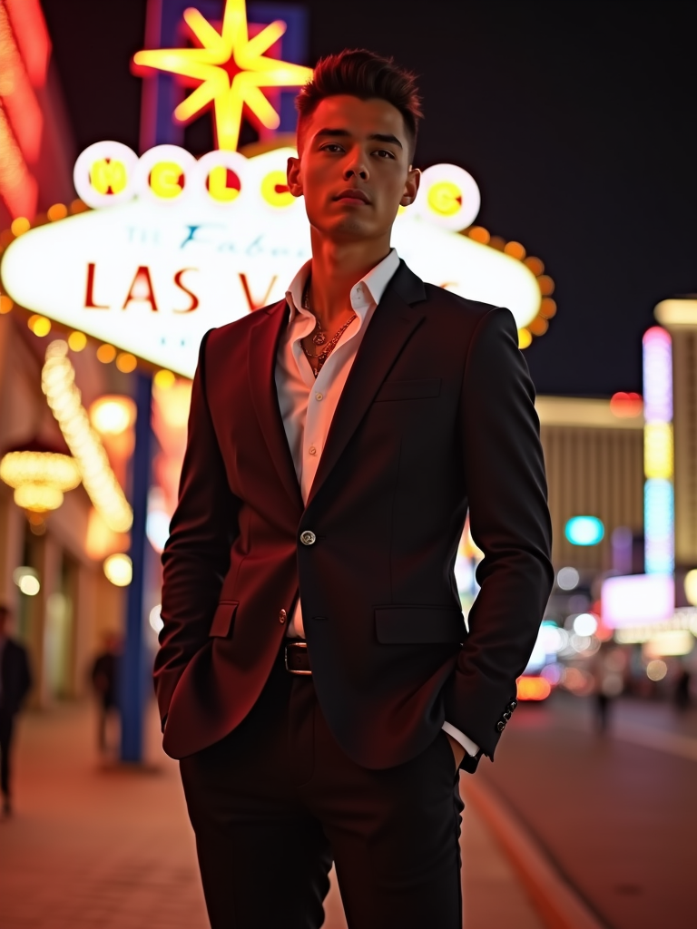 model in front of a famous Las Vegas show venue. at night. the model wears a sharp outfit, such as a fitted blazer and dress pants, highlighting the entertainment and excitement of the Las Vegas experience.