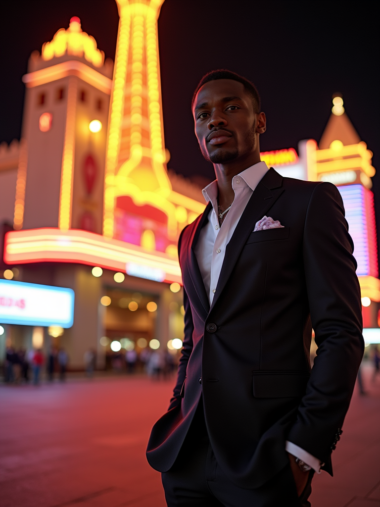 model in front of a famous Las Vegas show venue. at night. the model wears a sharp outfit, such as a fitted blazer and dress pants, highlighting the entertainment and excitement of the Las Vegas experience.