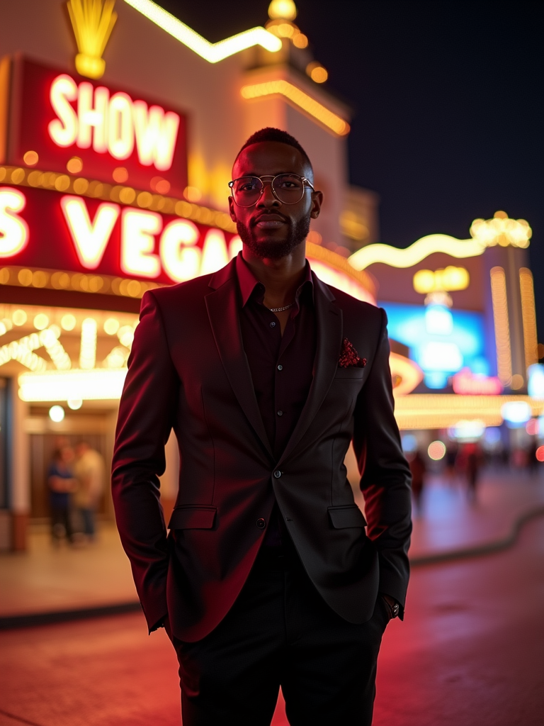 model in front of a famous Las Vegas show venue. at night. the model wears a sharp outfit, such as a fitted blazer and dress pants, highlighting the entertainment and excitement of the Las Vegas experience.