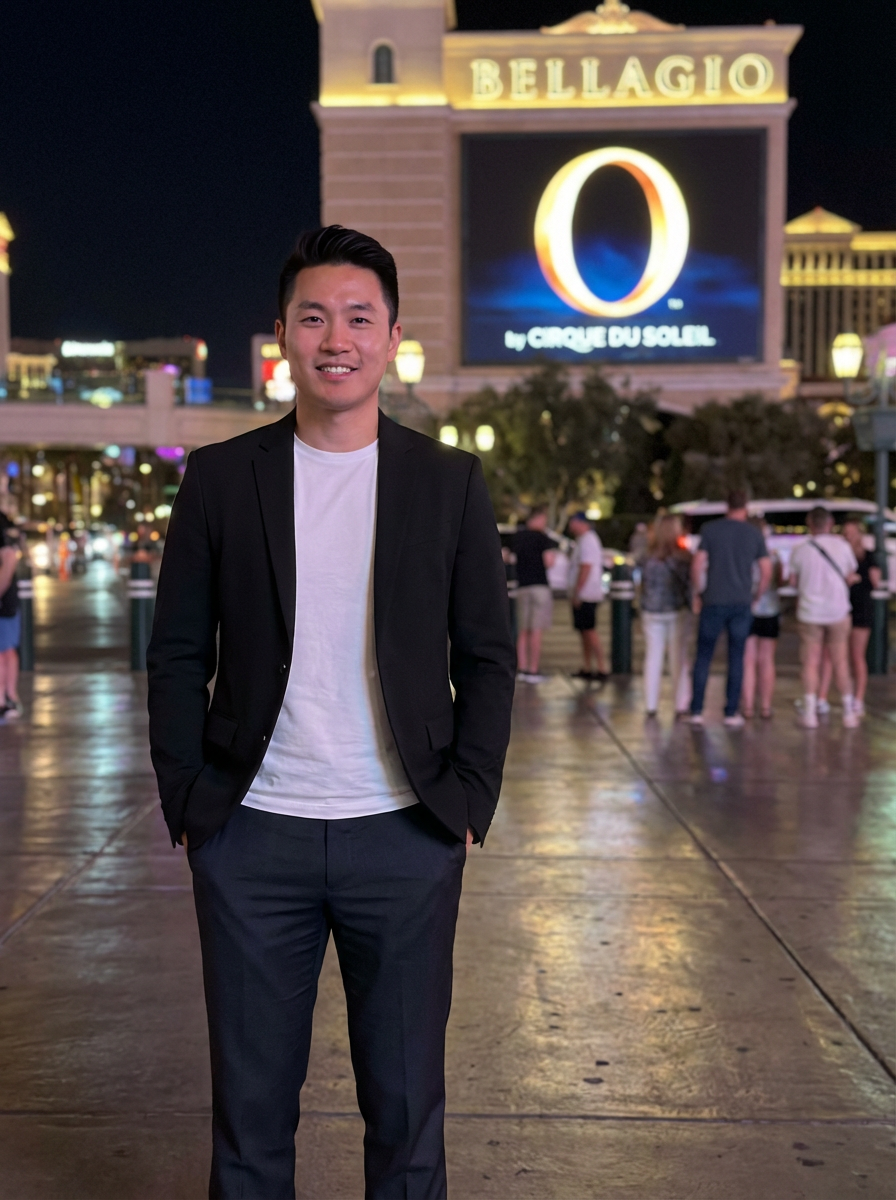 model in front of a famous Las Vegas show venue. at night. the model wears a sharp outfit, such as a fitted blazer and dress pants