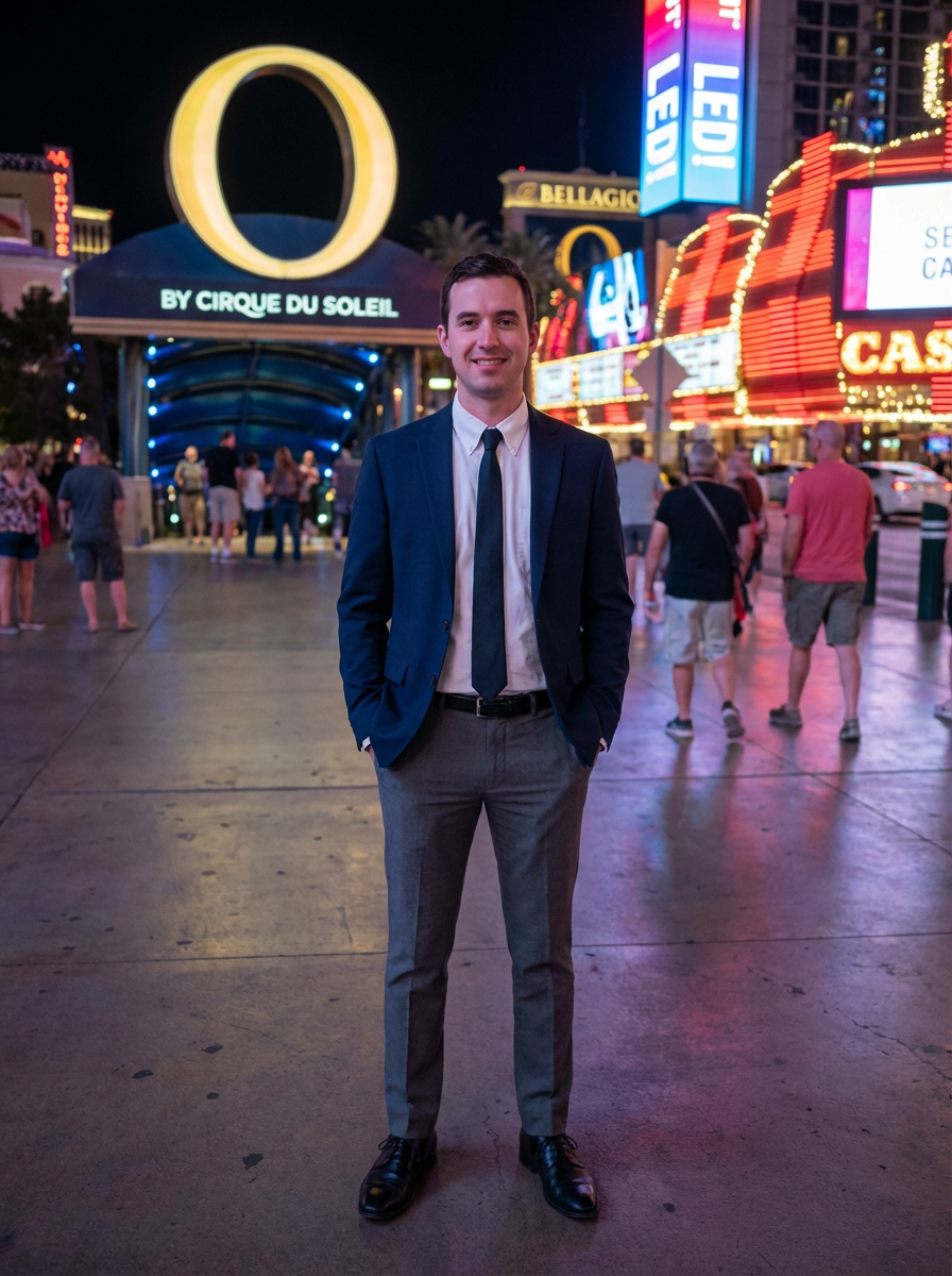 model in front of a famous Las Vegas show venue. at night. the model wears a sharp outfit, such as a fitted blazer and dress pants