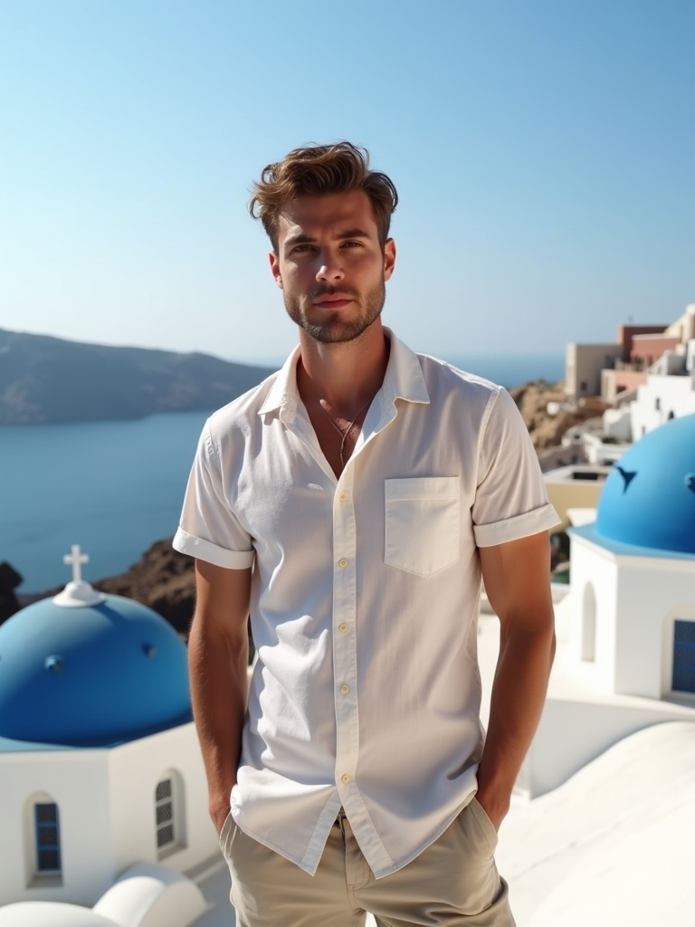 model in front of blue-domed churches in Oia, wearing a light linen shirt with beige shorts, brilliant sunshine and Aegean Sea in background
