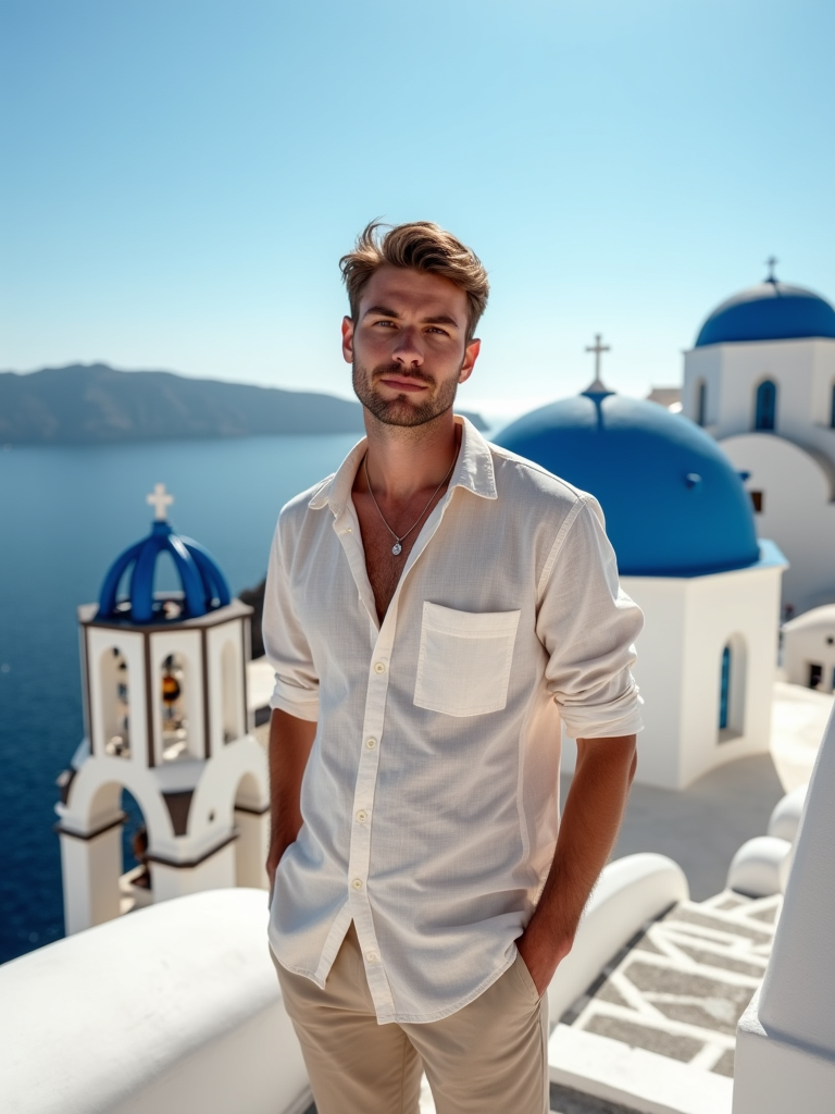 model in front of blue-domed churches in Oia, wearing a light linen shirt with beige shorts, brilliant sunshine and Aegean Sea in background