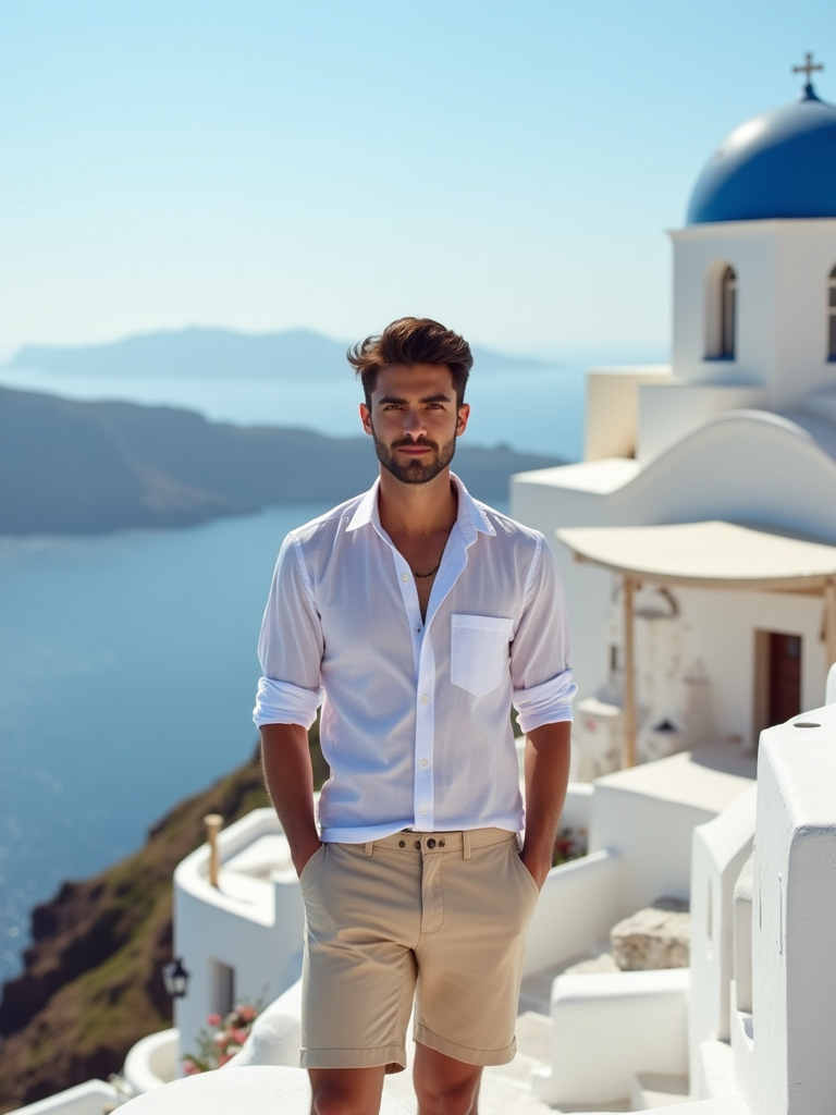 model in front of blue-domed churches in Oia, wearing a light linen shirt with beige shorts, brilliant sunshine and Aegean Sea in background