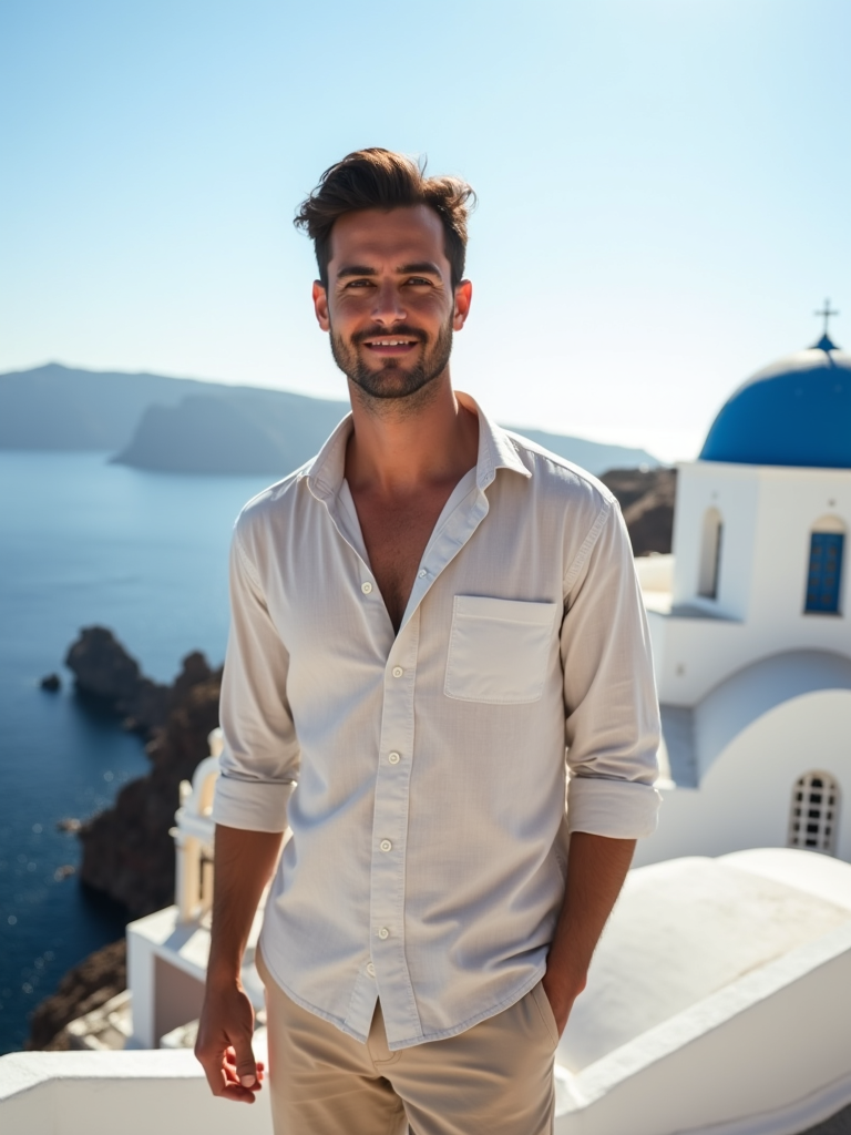 model in front of blue-domed churches in Oia, wearing a light linen shirt with beige shorts, brilliant sunshine and Aegean Sea in background