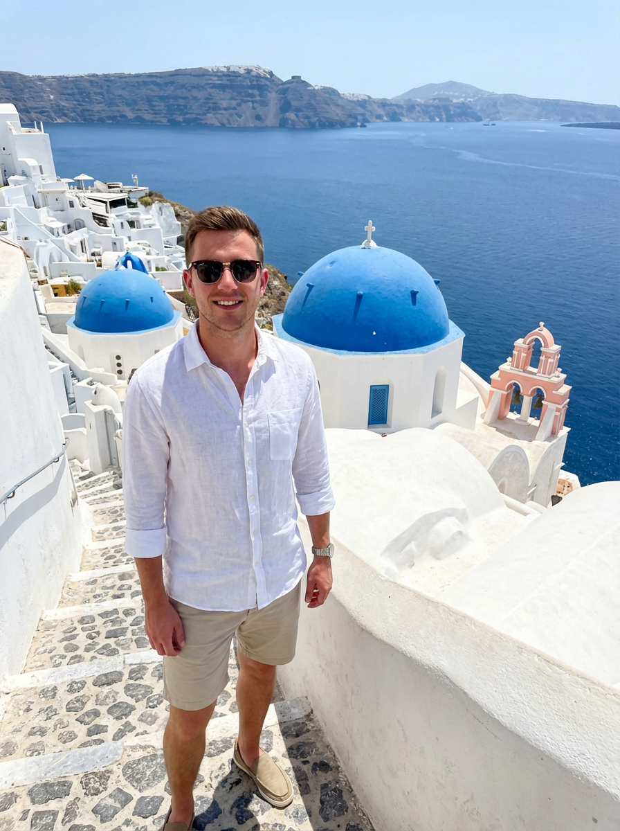 model in front of blue-domed churches in Oia, wearing a light linen shirt with beige shorts, brilliant sunshine and Aegean Sea in background