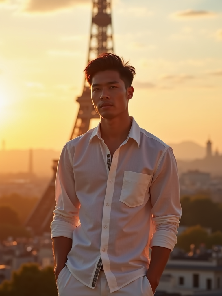 model in front of Eiffel Tower at sunset, wearing a light linen shirt and shorts, golden hour lighting