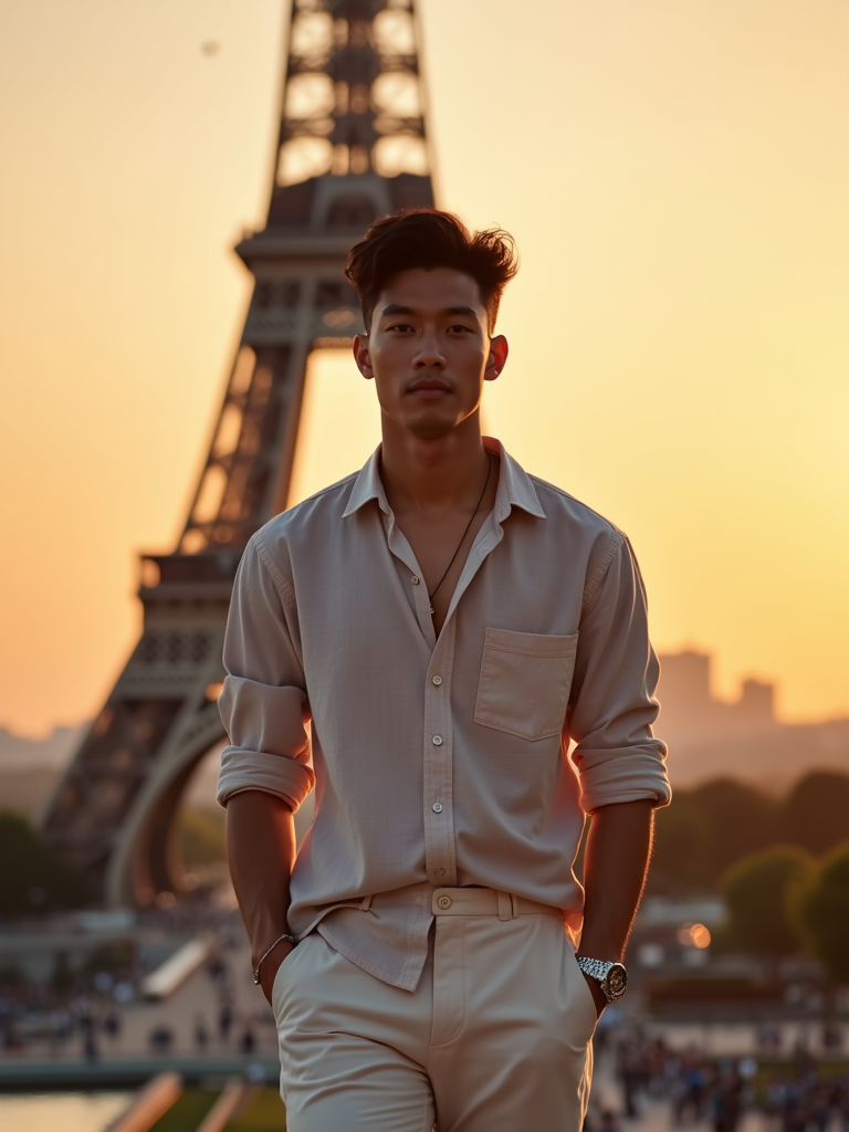 model in front of Eiffel Tower at sunset, wearing a light linen shirt and shorts, golden hour lighting