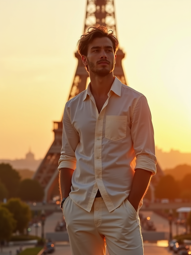 model in front of Eiffel Tower at sunset, wearing a light linen shirt and shorts, golden hour lighting