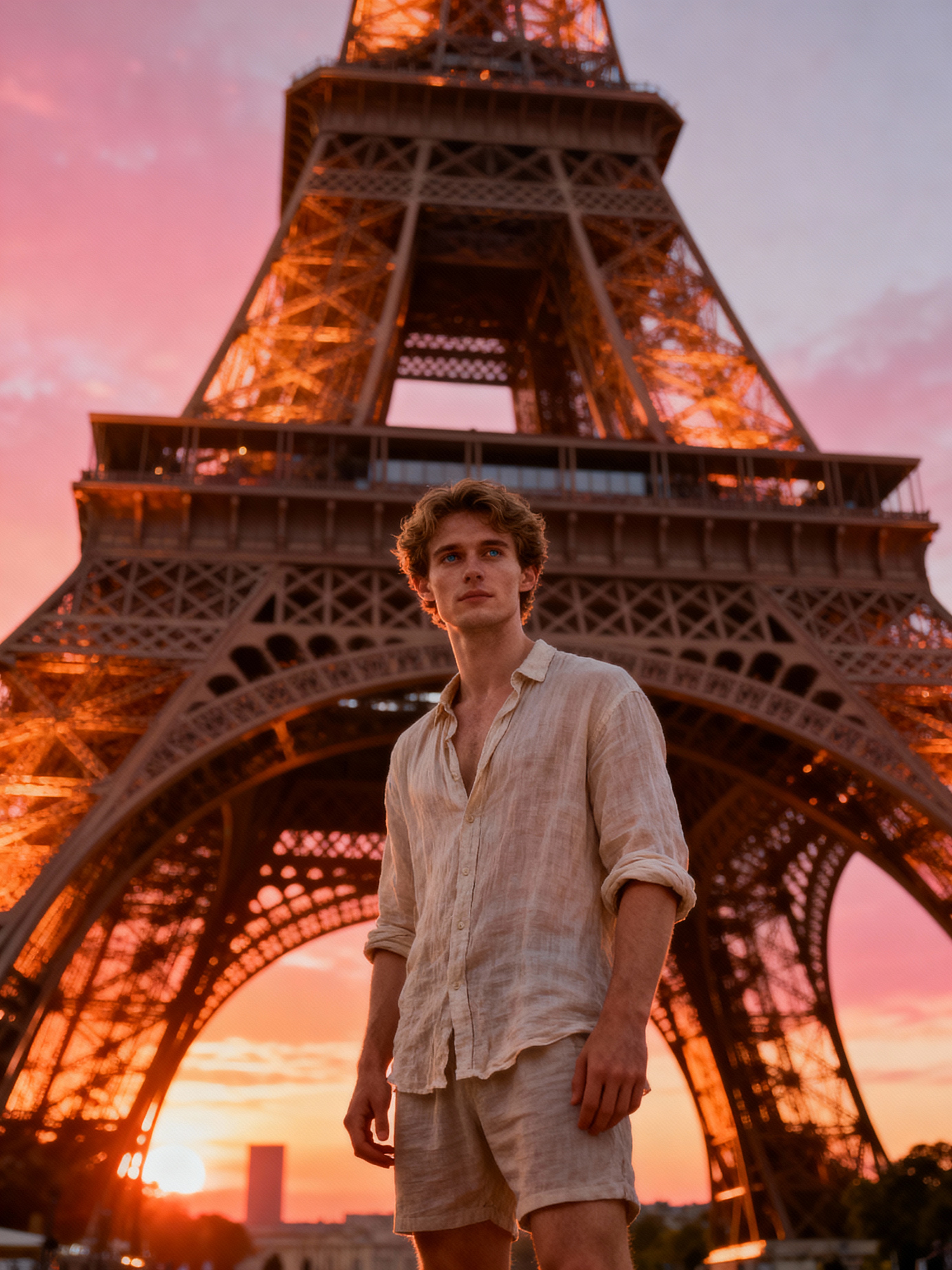 model in front of Eiffel Tower at sunset, wearing a light linen shirt and shorts, golden hour lighting
