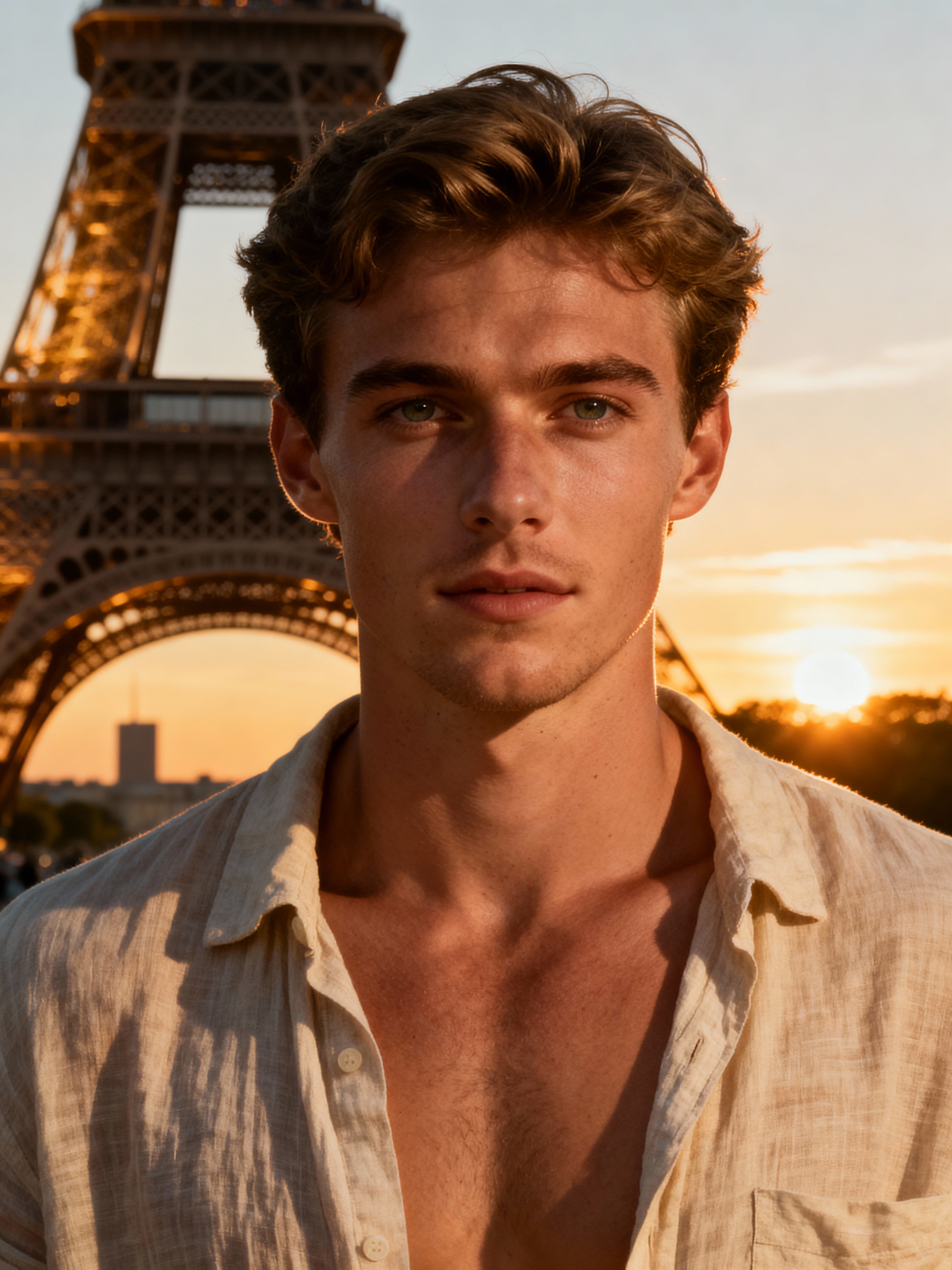 model in front of Eiffel Tower at sunset, wearing a light linen shirt and shorts, golden hour lighting