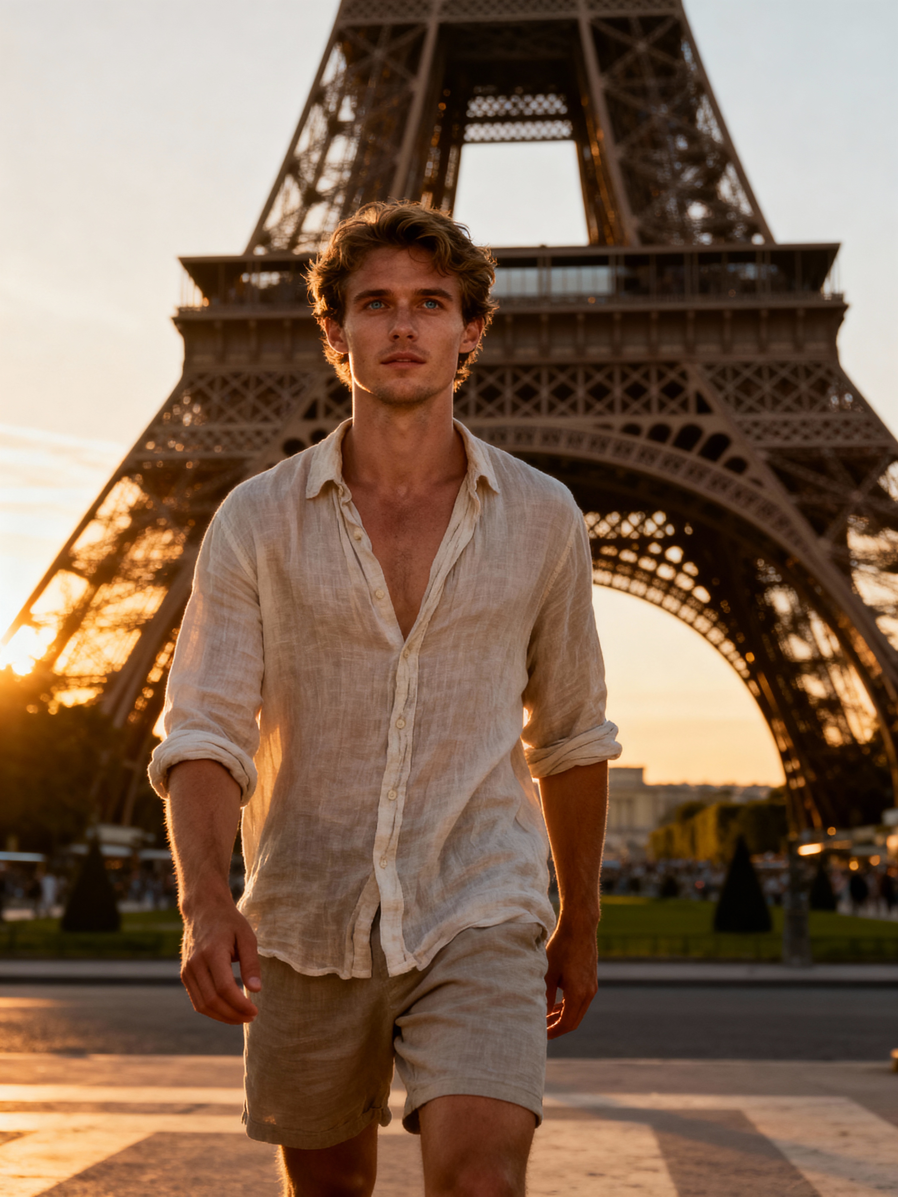 model in front of Eiffel Tower at sunset, wearing a light linen shirt and shorts, golden hour lighting