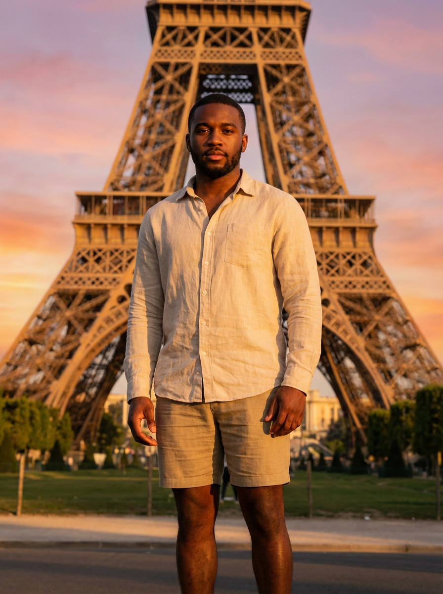 model in front of Eiffel Tower at sunset, wearing a light linen shirt and shorts, golden hour lighting