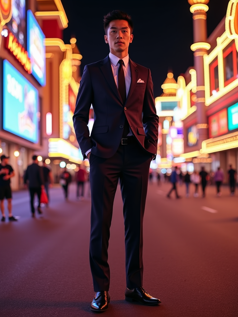 model in front of iconic Las Vegas casino signs. at night. the model wears a polished outfit, like a sharp suit with dress shoes, standing out against the neon lights.