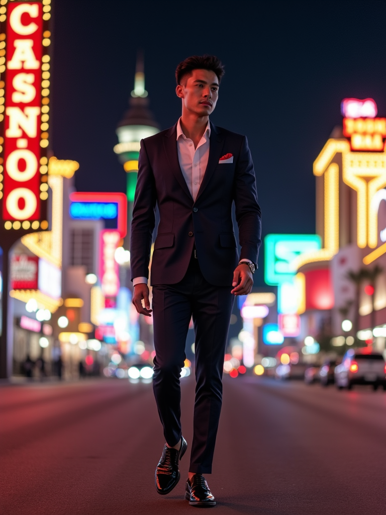model in front of iconic Las Vegas casino signs. at night. the model wears a polished outfit, like a sharp suit with dress shoes, standing out against the neon lights.