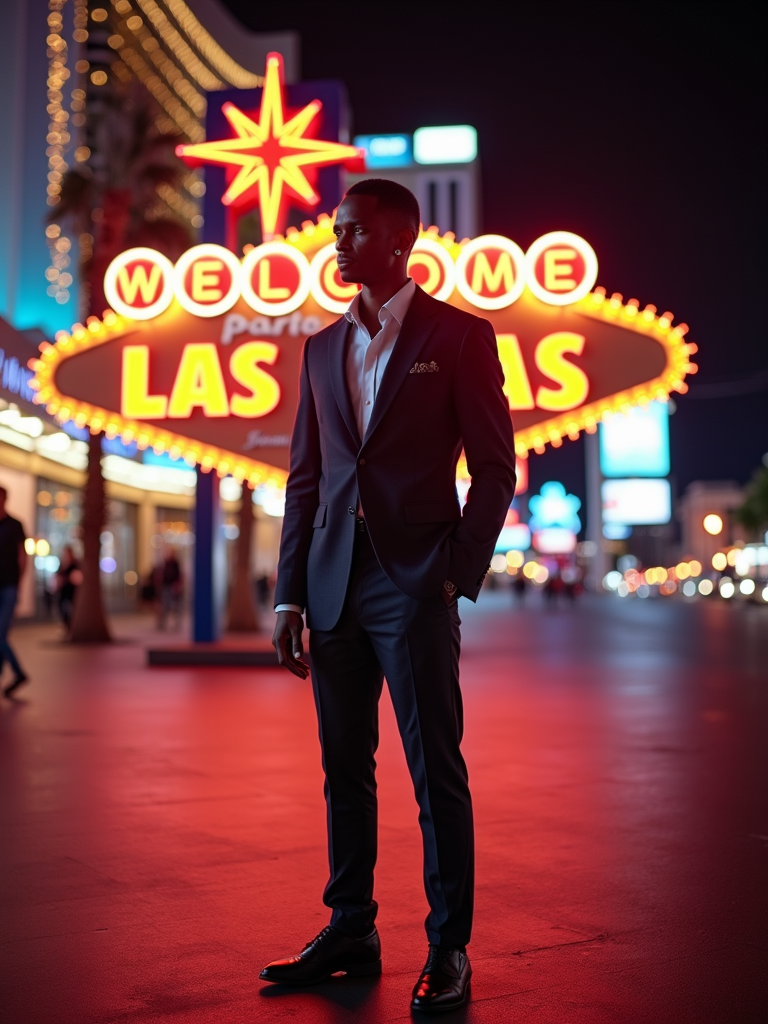 model in front of iconic Las Vegas casino signs. at night. the model wears a polished outfit, like a sharp suit with dress shoes, standing out against the neon lights.
