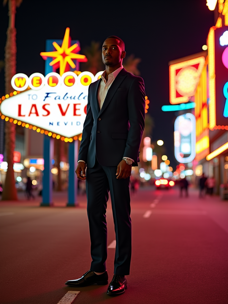 model in front of iconic Las Vegas casino signs. at night. the model wears a polished outfit, like a sharp suit with dress shoes, standing out against the neon lights.