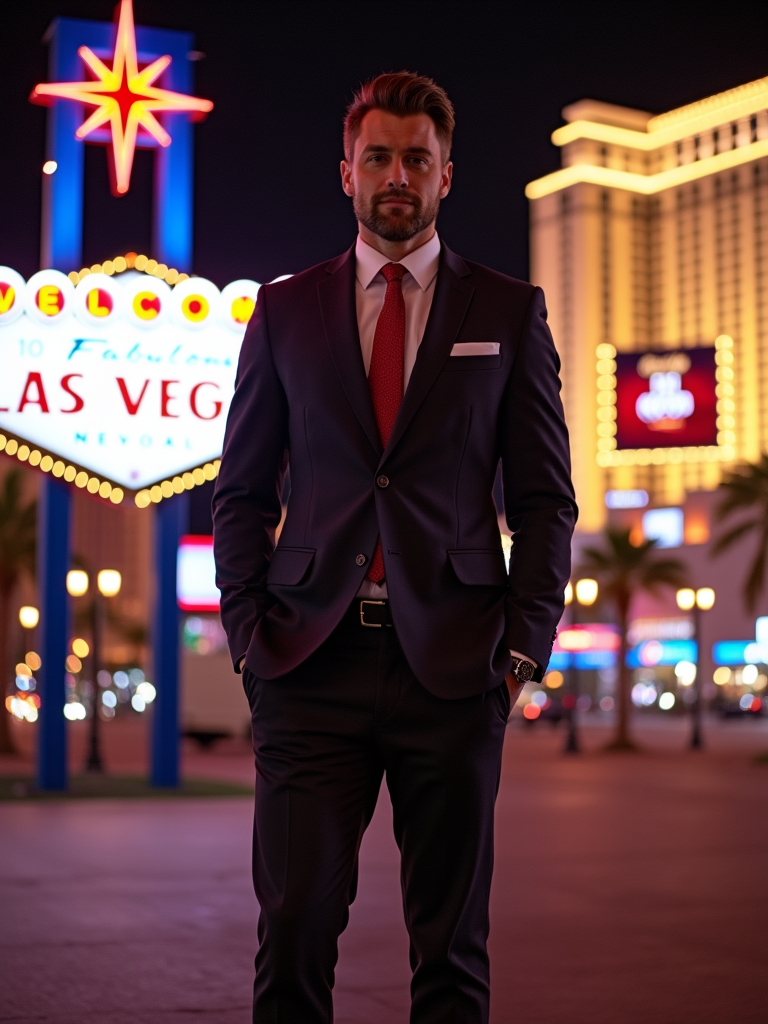 model in front of iconic Las Vegas casino signs. at night. the model wears a polished outfit, like a sharp suit with dress shoes, standing out against the neon lights.