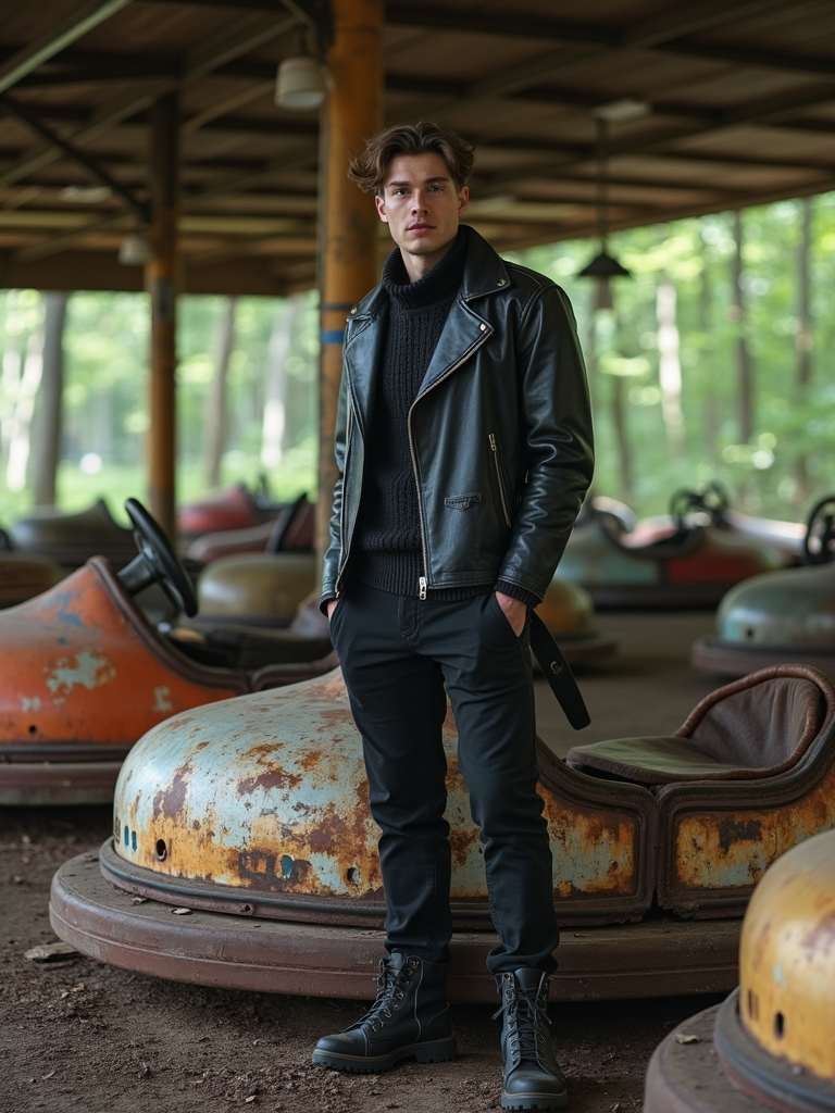 model in front of rusty bumper cars in abandoned overgrown amusement park in Chernobyl. wearing black boots and black pants.