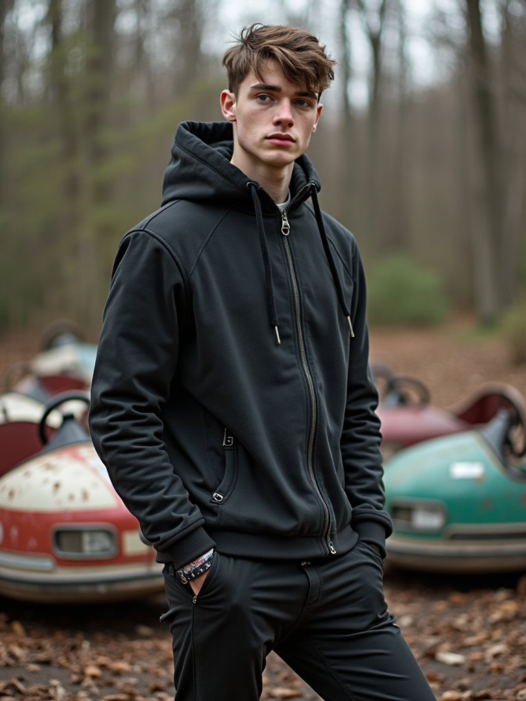 model in front of rusty bumper cars in abandoned overgrown amusement park in Chernobyl. wearing black boots and black pants.