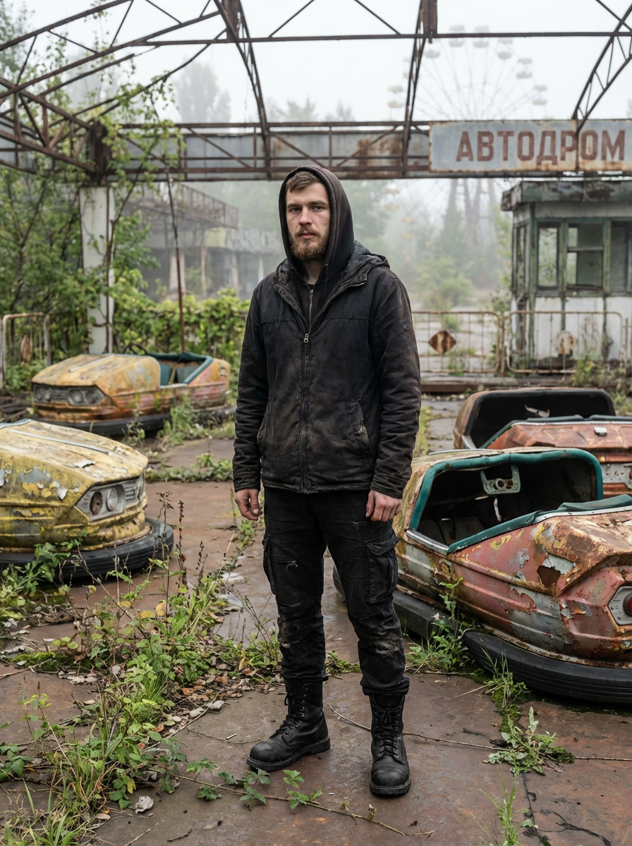 model in front of rusty bumper cars in abandoned overgrown amusement park in Chernobyl. wearing black boots and black pants.