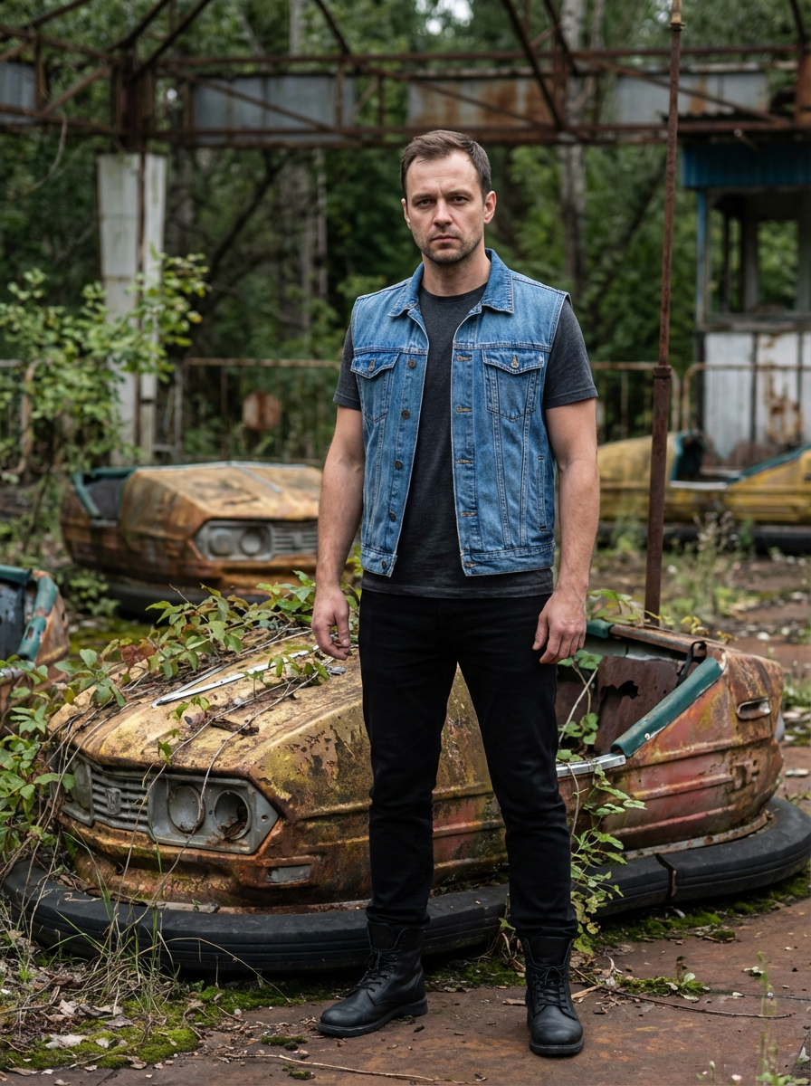model in front of rusty bumper cars in abandoned overgrown amusement park in Chernobyl. wearing black boots and black pants.